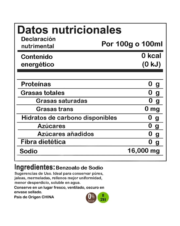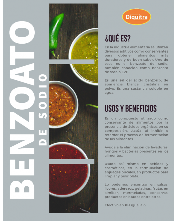 En la industria alimentaria se utilizan diversos aditivos como conservantes para obtener alimentos más duraderos y de buen sabor. Uno de esos es el benzoato de sodio, también conocido como benzoato de sosa o E211. Es una sal del ácido benzoico, de apariencia blanca, cristalina en polvo. Es una sustancia soluble en agua.