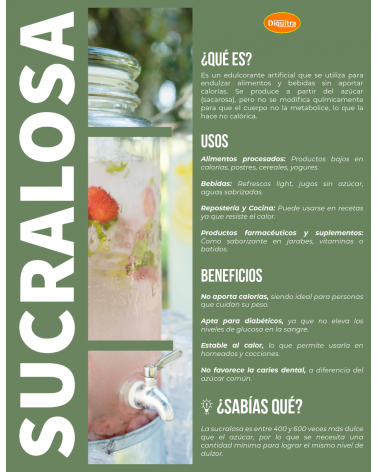Es un edulcorante artificial que se utiliza para endulzar alimentos y bebidas sin aportar calorías. Se produce a partir del azúcar (sacarosa), pero no se modifica químicamente para que el cuerpo no la metabolice, lo que la hace no calórica.