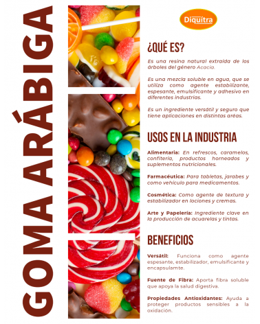 Es una resina natural extraída de los árboles del género Acacia. Es una mezcla soluble en agua, que se utiliza como agente estabilizante, espesante, emulsificante y adhesivo en diferentes industrias. Es un ingrediente versátil y seguro que tiene aplicaciones en distintas áreas.
