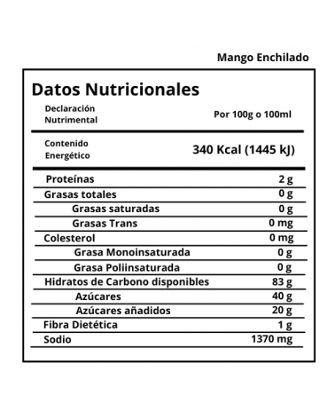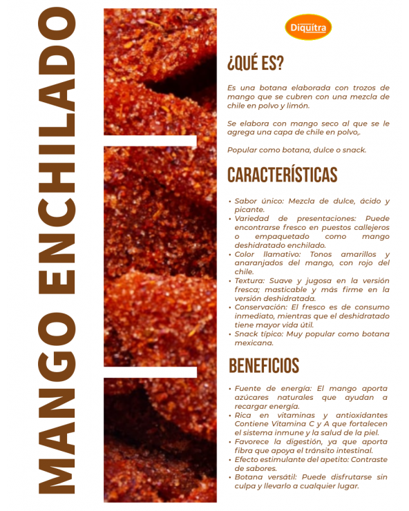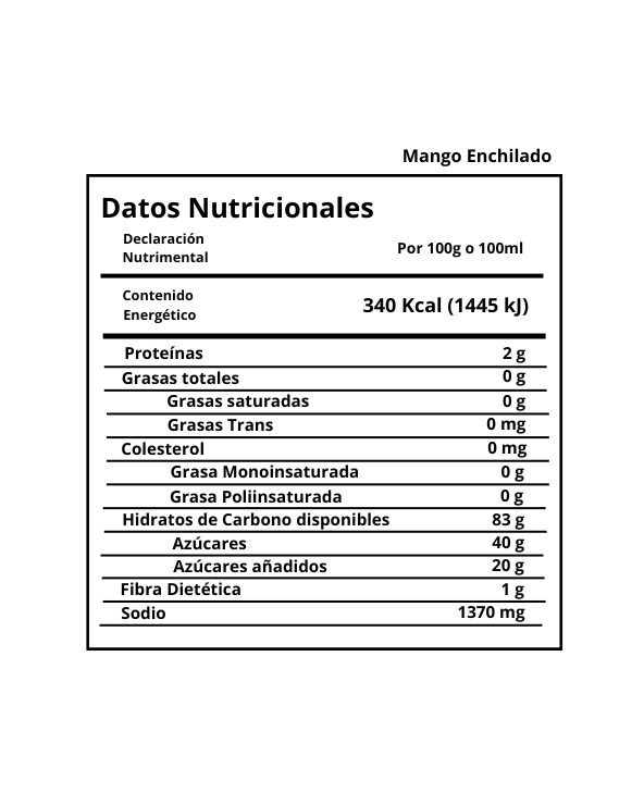 Perfecto para aquellos que desean disfrutar de un aperitivo entre comidas o para incorporar en recetas, el mango enchilado se convierte en una opción versátil para toda ocasión. Este producto es ideal para personas activas que buscan un impulso energético en su día a día, así como para familias que desean añadir variedad y sabor a su alimentación.