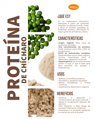 La proteína de chícharo en polvo de Diquitra es un suplemento ideal para quienes buscan una alternativa vegetal rica en proteínas. Elaborada al 100% con chícharos, este producto es perfecto para veganos, vegetarianos y cualquier persona que desee incrementar su ingesta proteica de forma natural.