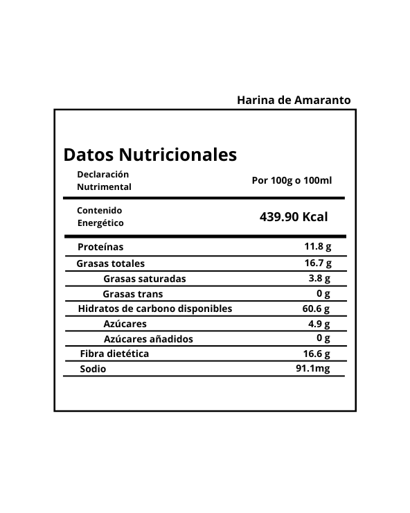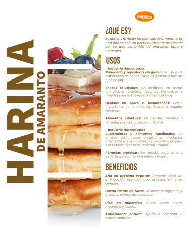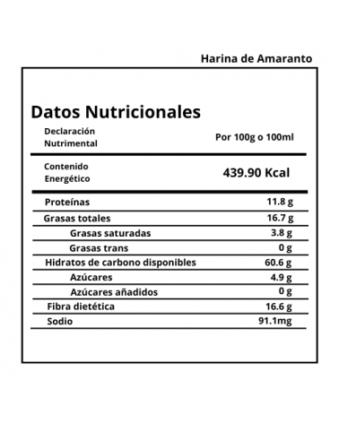 Se obtiene al moler las semillas de amaranto. Es una harina con un perfil nutricional destacado por su alto contenido de proteínas, fibra y minerales.