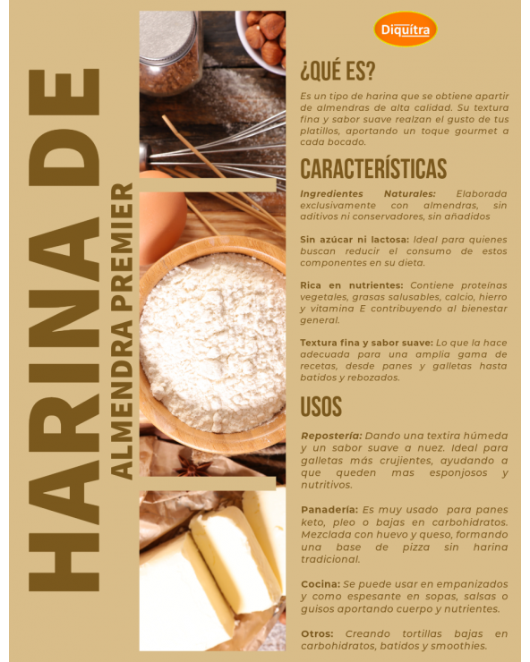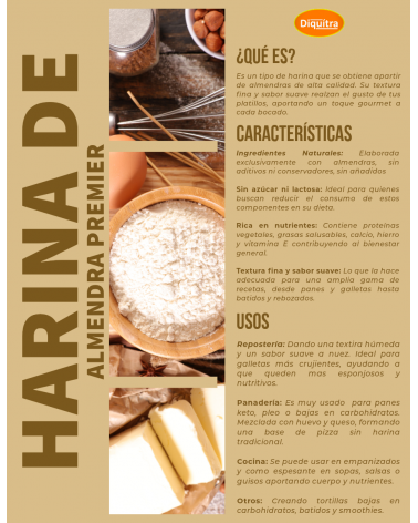 La Harina de Almendra Premier Sin Añadidos es la opción ideal para quienes buscan una alternativa saludable y versátil en su cocina. Elaborada a partir de almendras de alta calidad, esta harina es perfecta para preparar una variedad de recetas, desde panes y galletas hasta batidos y rebozados. Su textura fina y sabor suave realzan el gusto de tus platillos, aportando un toque gourmet a cada bocado.