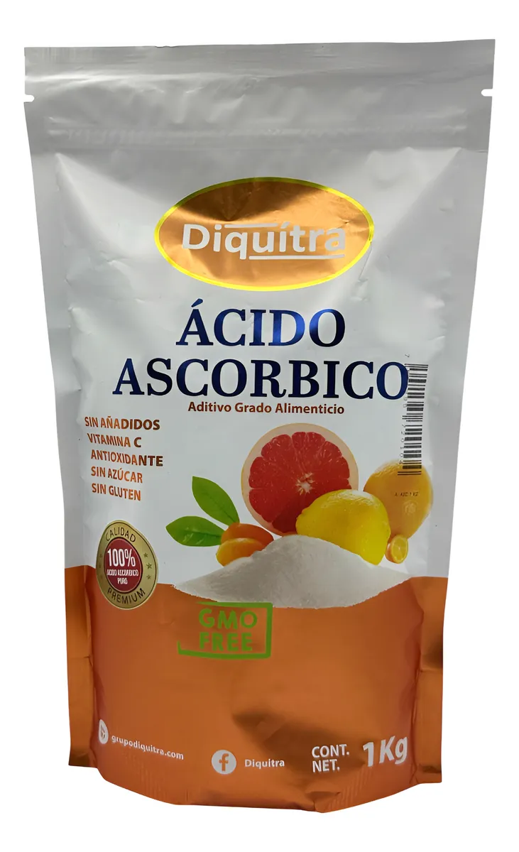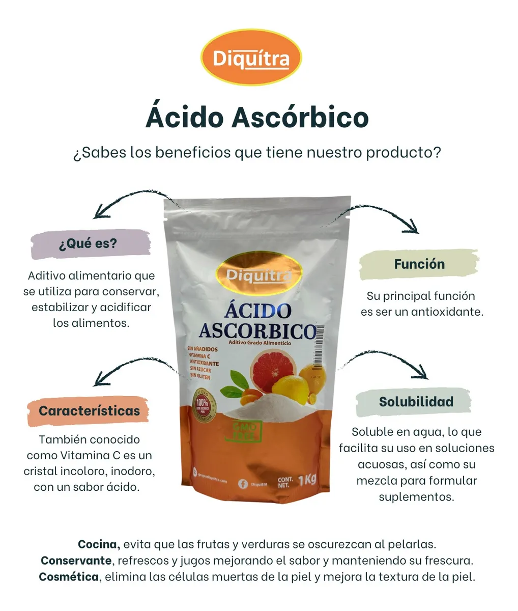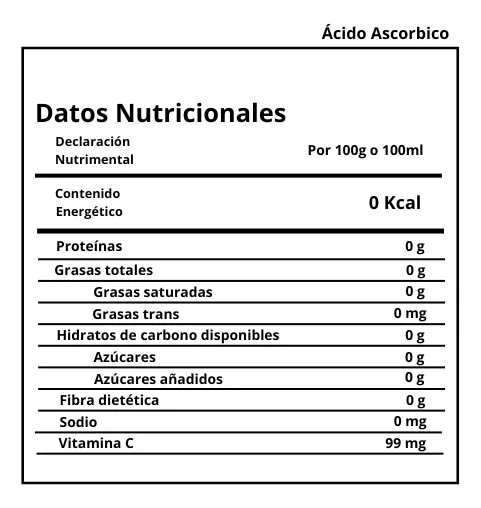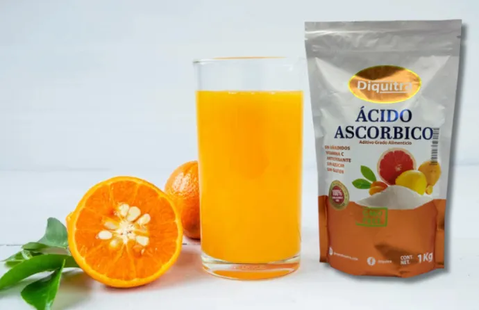 Usos: En suplementos ascórbicos, conservantes, refrescos y jugos mejorando el sabor y manteniendo su frescura. Panadería y repostería.