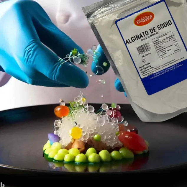 El alginato de sodio es uno de los ingredientes clave utilizados en la técnica de cocina molecular, conocida como ‘esferificación’. Esta técnica se utiliza para crear pequeñas esferas que contienen líquido dentro, lo que permite la creación de platos y presentaciones culinarias únicas.