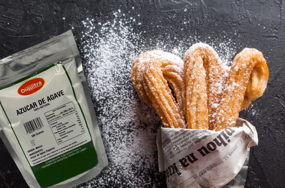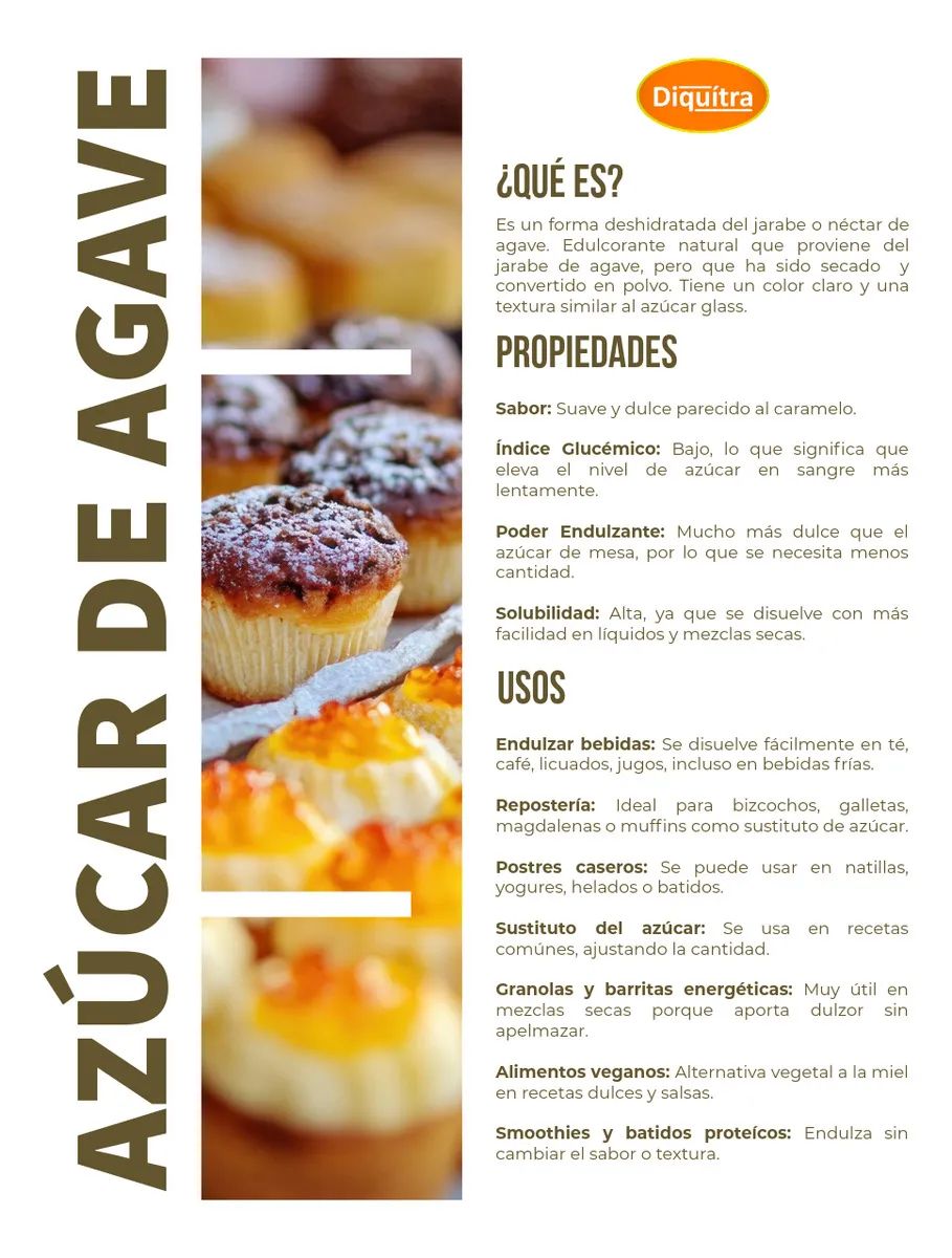 Azúcar de Agave Grado Alimenticio. Es un forma deshidratada del jarabe o néctar de agave. Edulcorante natural que proviene del jarabe de agave, pero que ha sido secado y convertido en polvo. Tiene un color claro y una textura similar al azúcar glass.