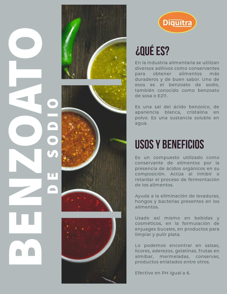 En la industria alimentaria se utilizan diversos aditivos como conservantes para obtener alimentos más duraderos y de buen sabor. Uno de esos es el benzoato de sodio, también conocido como benzoato de sosa o E211. Es una sal del ácido benzoico, de apariencia blanca, cristalina en polvo. Es una sustancia soluble en agua.