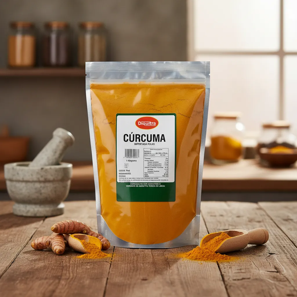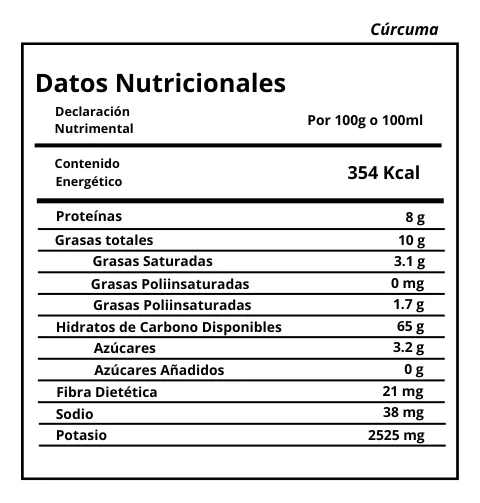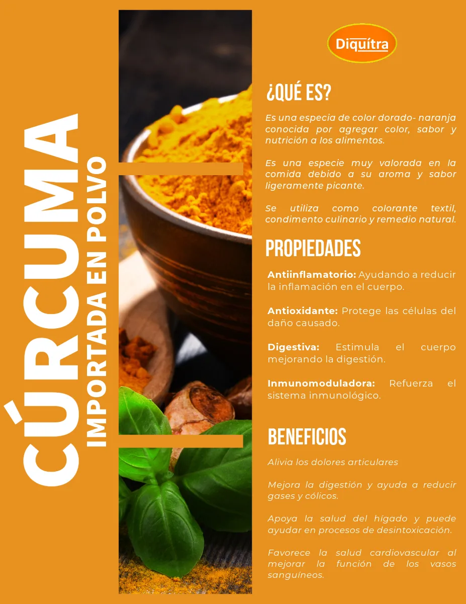 Cúrcuma Convencional. Es una especia de color dorado- naranja conocida por agregar color, sabor y nutrición a los alimentos. Es una especie muy valorada en la comida debido a su aroma y sabor ligeramente picante. Se utiliza como colorante textil, condimento culinario y remedio natural.