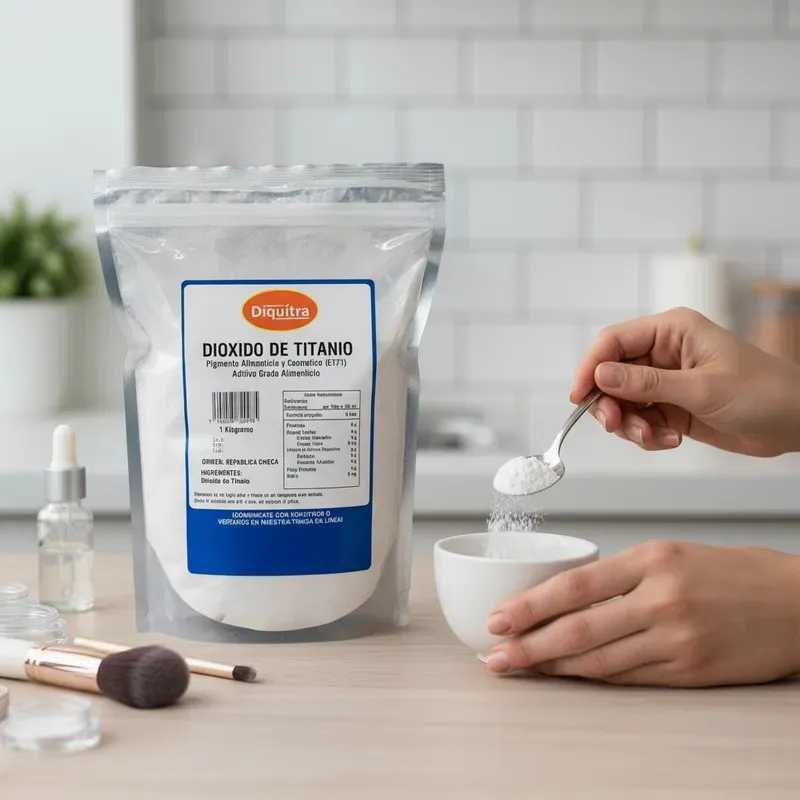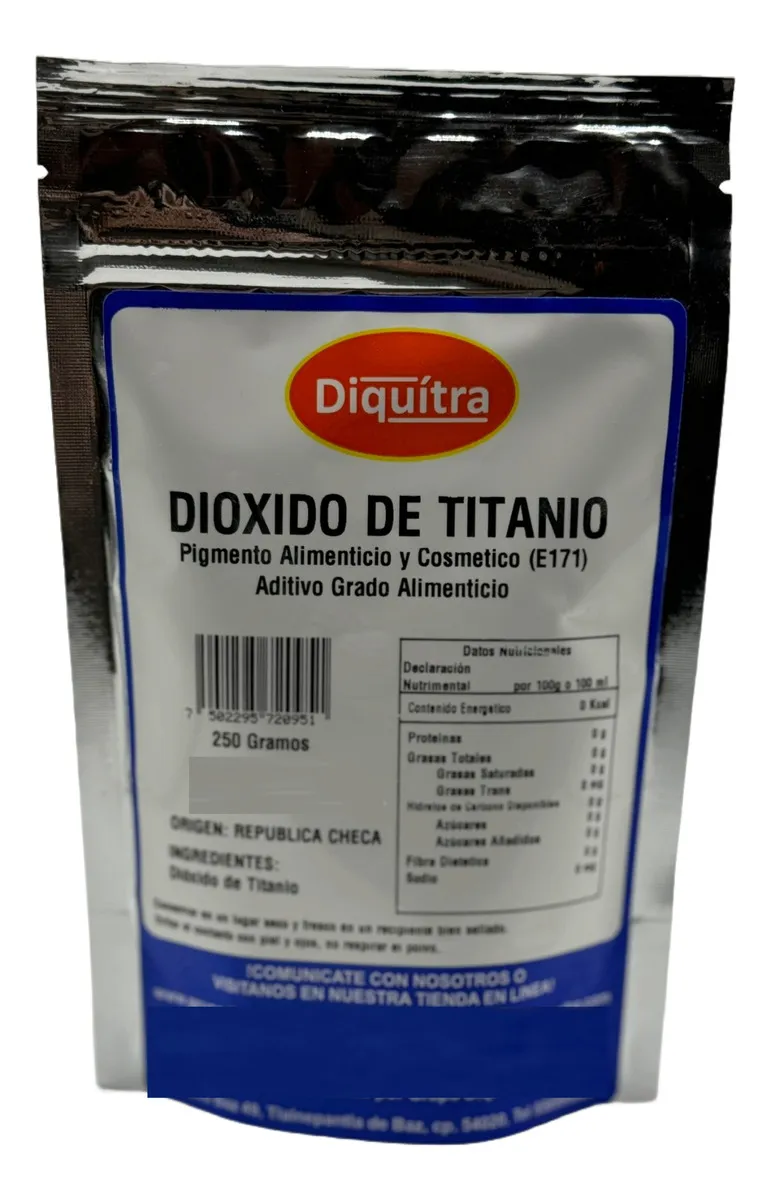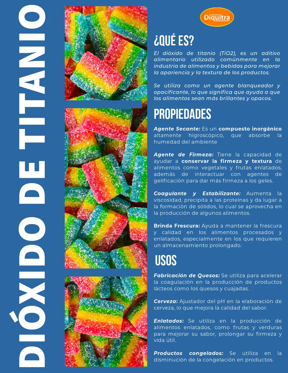 Dióxido de Titanio FG (Grado Alimenticio). El dióxido de titanio (TiO2), es un aditivo alimentario utilizado comúnmente en la industria de alimentos y bebidas para mejorar la apariencia y la textura de los productos. Se utiliza como un agente blanqueador, lo que significa que ayuda a que los alimentos sean más brillantes y opacos.