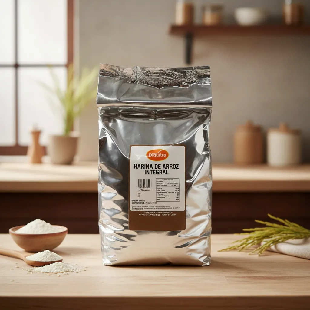 Harina de Arroz Integral: Contiene más fibra, nutrientes y sabor más fuerte, al conservar el salvado y el germen de arroz.