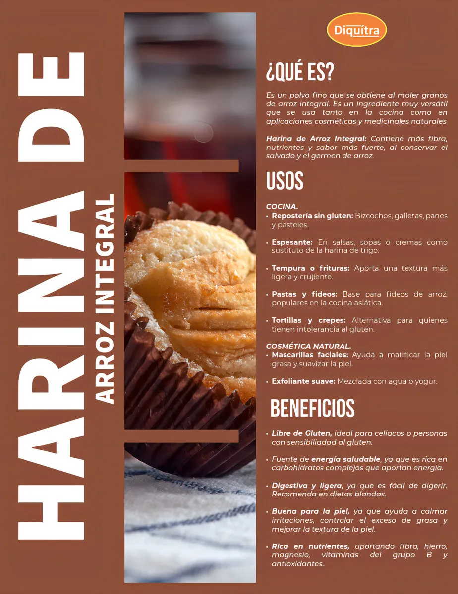 Es un polvo fino que se obtiene al moler granos de arroz integral. Es un ingrediente muy versátil que se usa tanto en la cocina como en aplicaciones cosméticas y medicinales naturales.