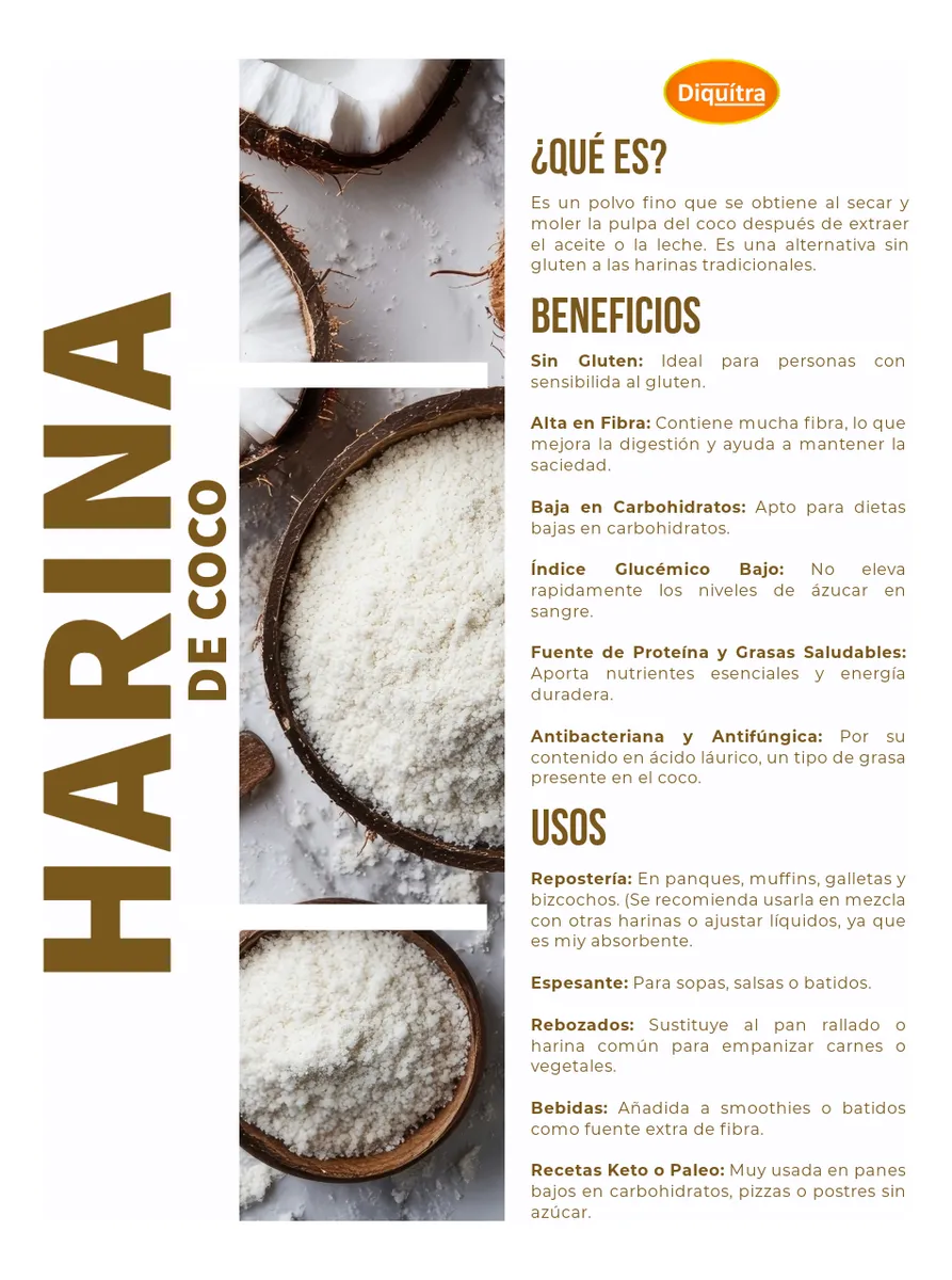 • Es rica en proteína, fibra y grasa, lo que la hace saciante, adicionalmente, la proteína y las grasas presentes en la harina de coco reducirán la carga glucémica de masas hechas con endulzantes.