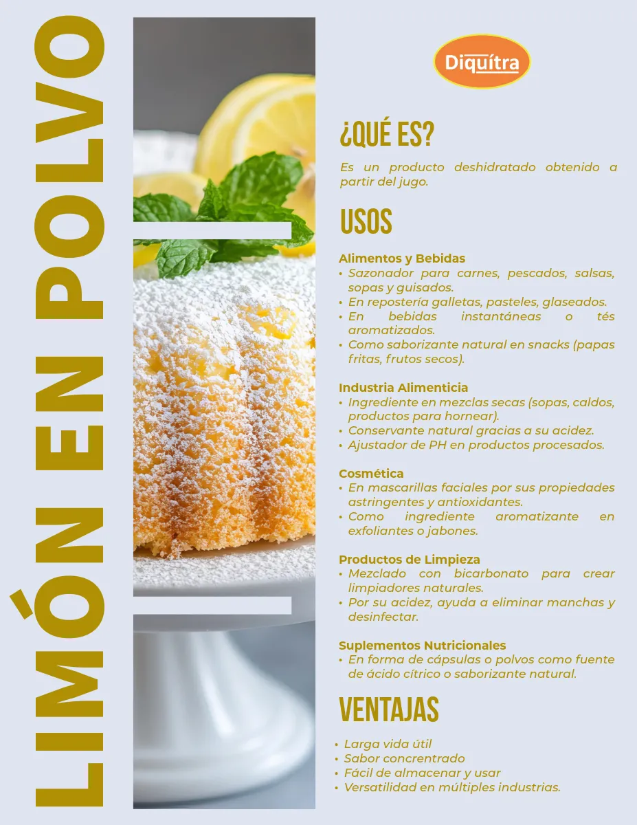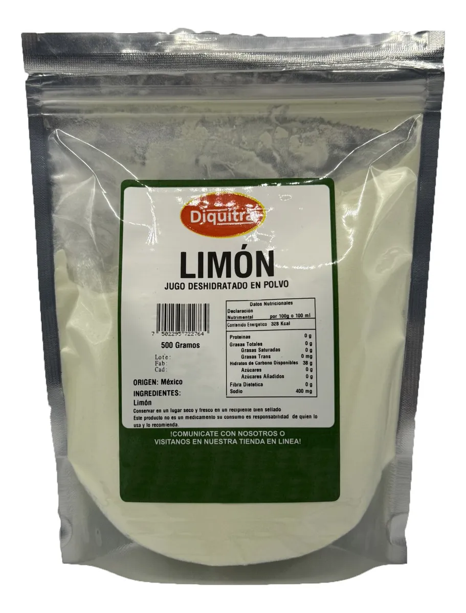 Jugo de Limón Deshidratado en Polvo. El Limón Deshidratado en Polvo de la marca Diquitra es la opción perfecta para darle un toque cítrico a tus bebidas y recetas favoritas.