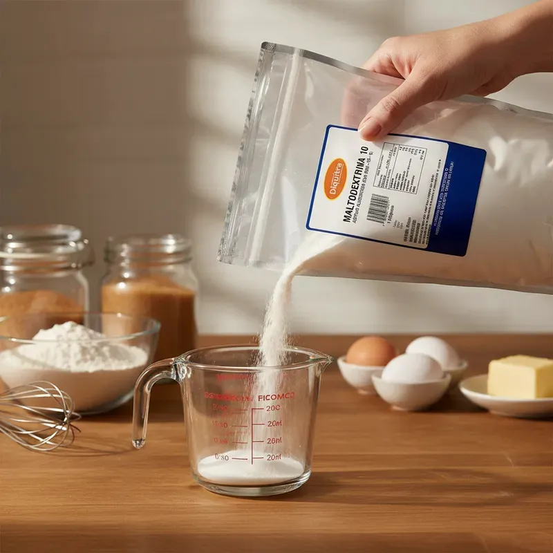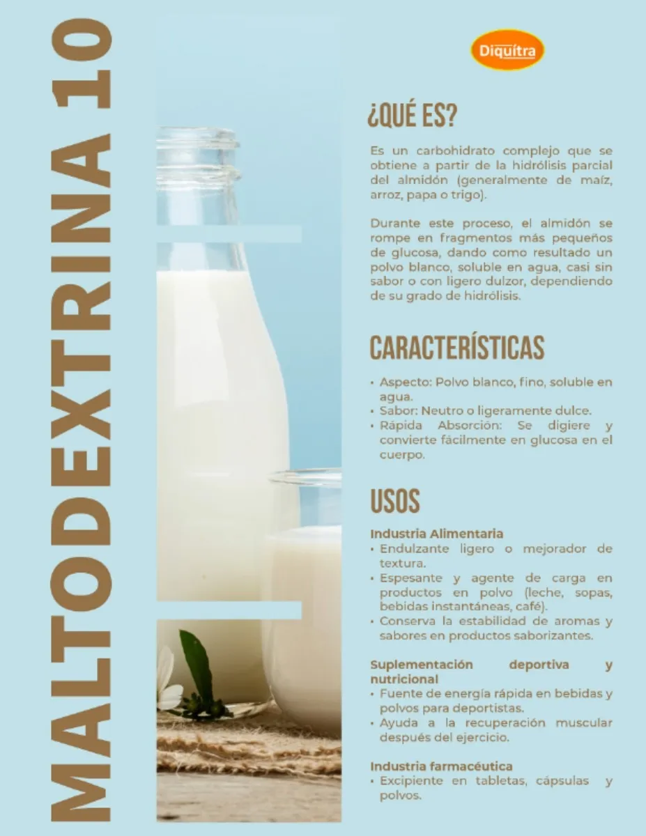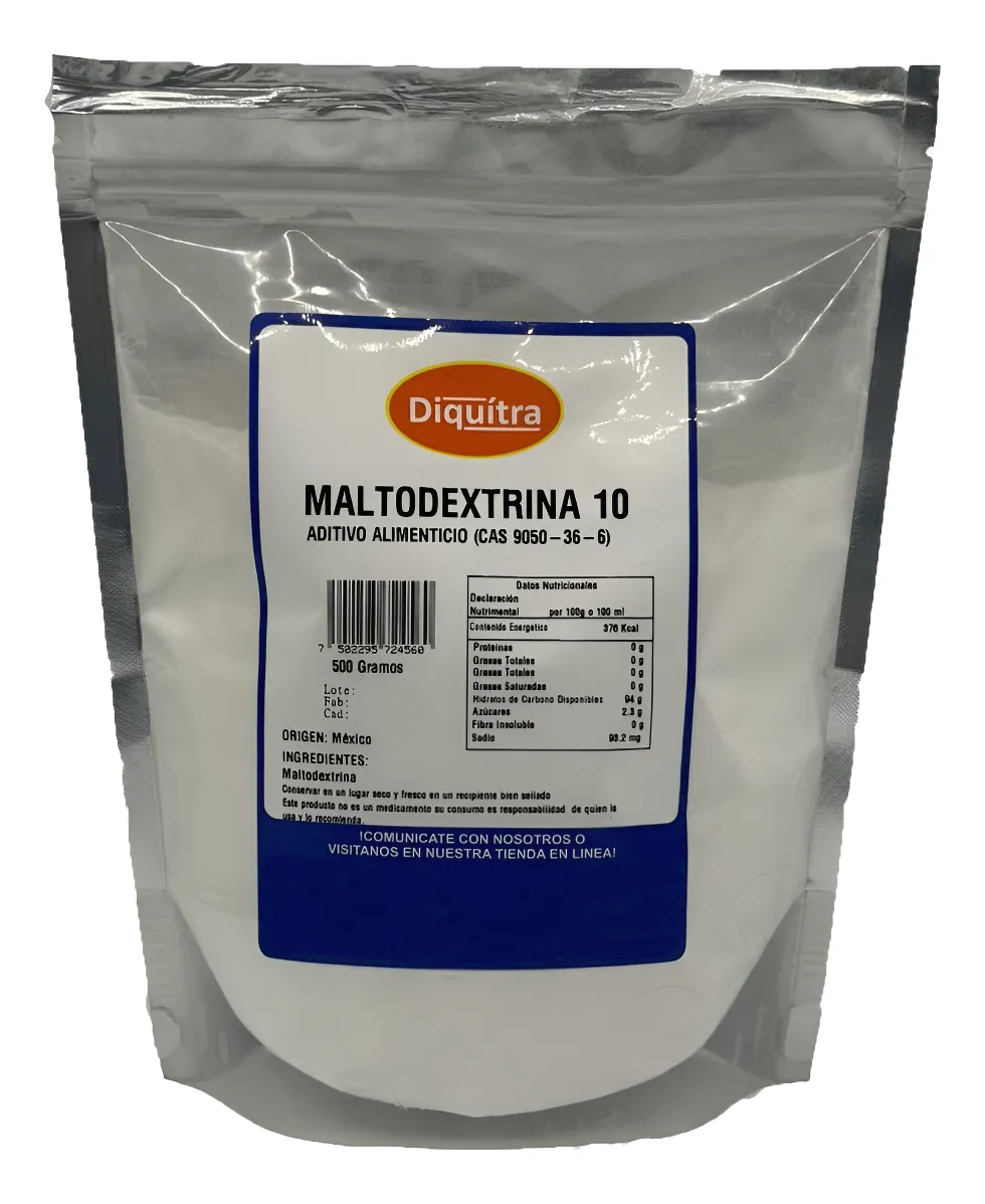 Es un carbohidrato complejo que se obtiene a partir de la hidrólisis parcial del almidón (generalmente de maíz, arroz, papa o trigo). Durante este proceso, el almidón se rompe en fragmentos más pequeños de glucosa, dando como resultado un polvo blanco, soluble en agua, casi sin sabor o con ligero dulzor, dependiendo de su grado de hidrólisis.