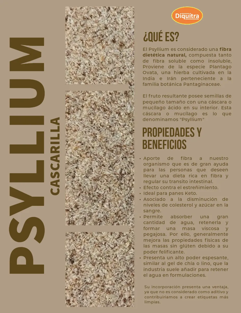 El Psyllium es considerado una fibra dietética natural, compuesta tanto de fibra soluble como insoluble, Proviene de la especie Plantago Ovata, una hierba cultivada en la India e Irán perteneciente a la familia botánica Pantaginaceae. El fruto resultante posee semillas de pequeño tamaño con una cáscara o mucílago ácido en su interior. Esta cáscara o mucílago es lo que denominamos «Psyllium».