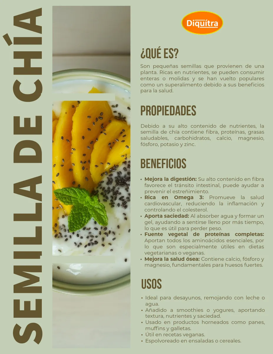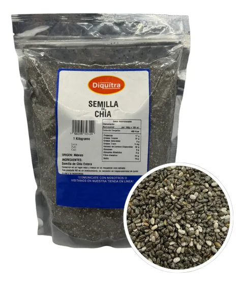 + Descubre la Semilla de Chía Granel Calidad Premium de la marca DIQUITRA. Esta bolsa resellable contiene semillas de chía de alta calidad, perfectas para incorporar en tu dieta diaria.