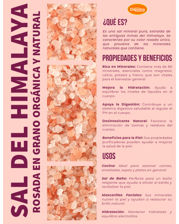 Es una sal mineral pura, extraída de las antiguas minas del Himalaya. Se caracteriza por su color rosado único, que proviene de los minerales naturales que contiene.