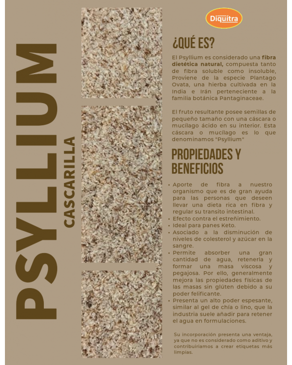 Propiedades y Beneficios: Aporte de fibra a nuestro organismo que es de gran ayuda para las personas que deseen llevar una dieta rica en fibra y regular su transito intestinal. Efecto contra el estreñimiento. Ideal para panes Keto. Asociado a la disminución de niveles de colesterol y azúcar en la sangre. Permite absorber una gran cantidad de agua, retenerla y formar una masa viscosa y pegajosa. Por ello, generalmente mejora las propiedades físicas de las masas sin glúten debido a su poder felificante. Presenta un alto poder espesante, similar al gel de chía o lino, que la industria suele añadir para retener el agua en formulaciones.