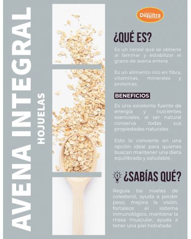 Es un cereal que se obtiene al laminar y estabilizar el grano de avena entera Es un alimento rico en fibra, vitaminas, minerales y proteínas.