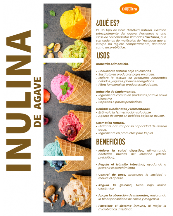 Es un tipo de fibra dietética natural, extraída principalmente del agave. Pertenece a una clase de carbohidratos llamados fructanos, que son cadenas de moléculas de fructuosa que el cuerpo no digiere completamente, actuando como un prebiótico.
