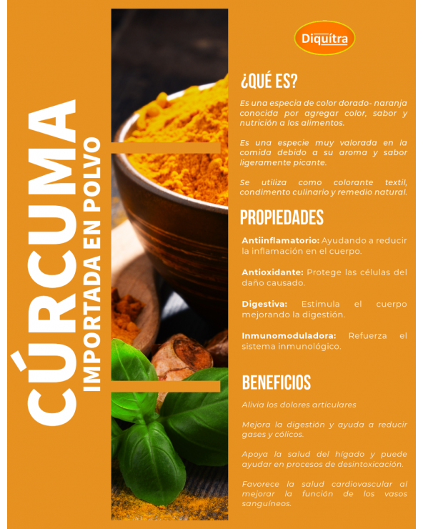 Es una especia de color dorado- naranja conocida por agregar color, sabor y nutrición a los alimentos. Es una especie muy valorada en la comida debido a su aroma y sabor ligeramente picante. Se utiliza como colorante textil, condimento culinario y remedio natural.